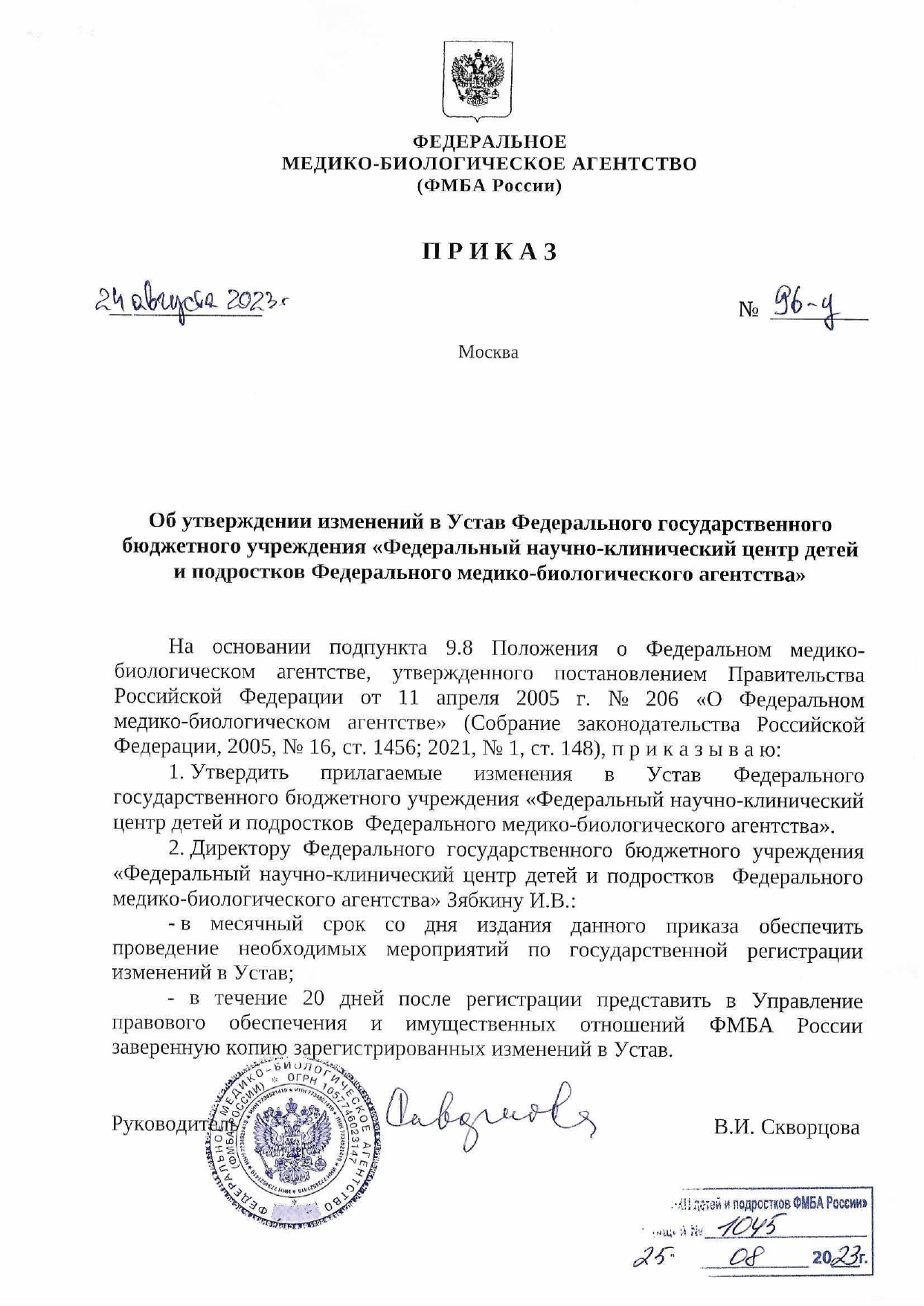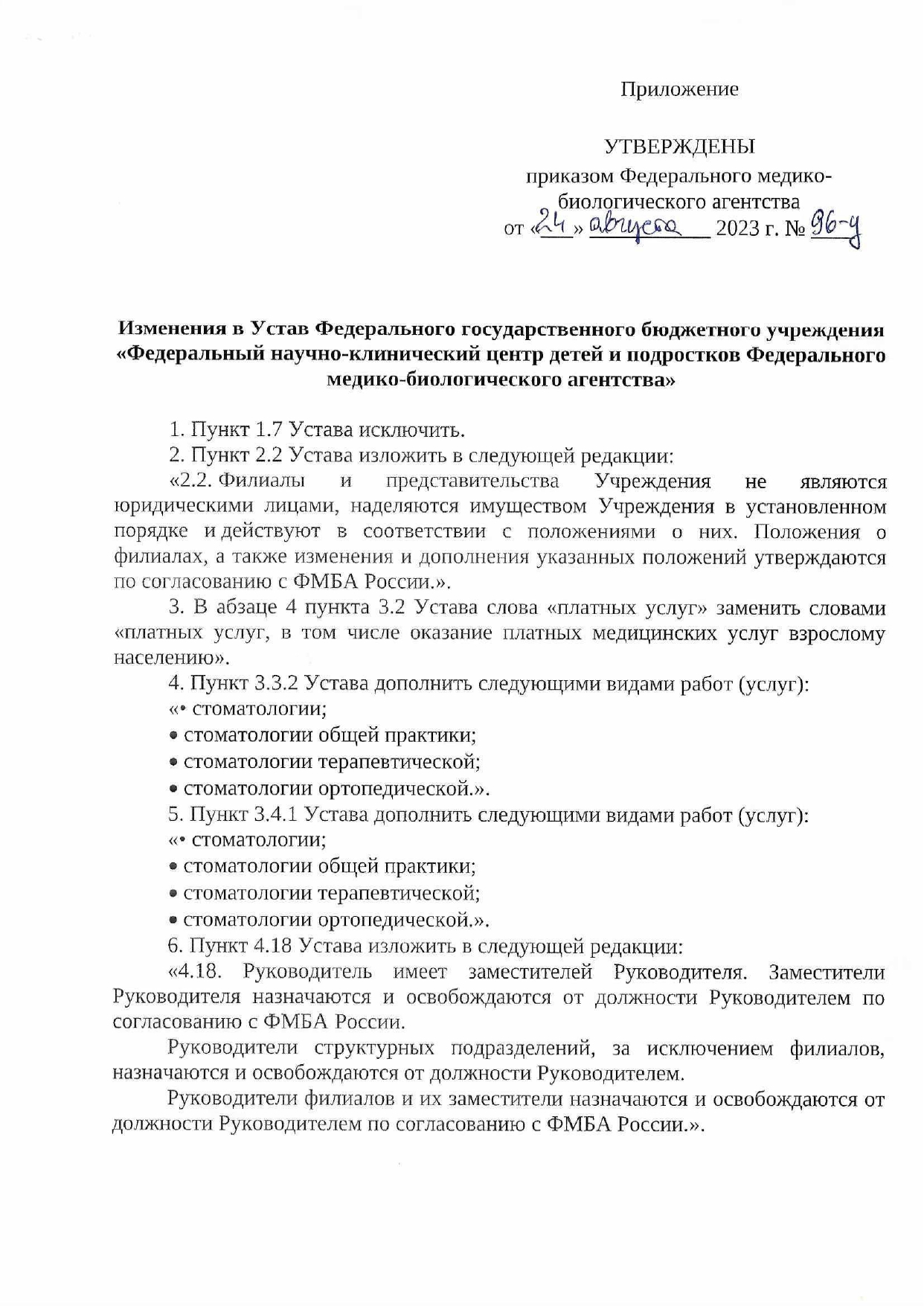 Изменения в Устав ФГБУ “ФНКЦ детей и подростков ФМБА России» от 24.08.2024
