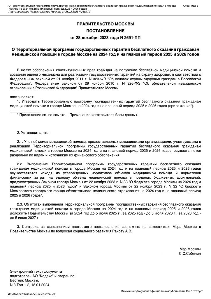 Постановление от 28 декабря 2023 года №2691-ПП О Территориальной программе госдарственных гарантий бесплатного оказания гражданам медицинской помощи в городе Москве на 2024 год и на плановый период 2025 и 2026 годов.