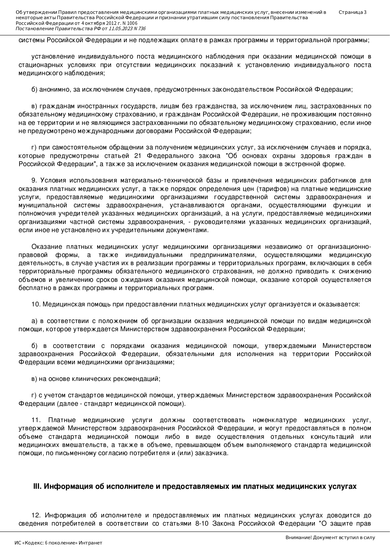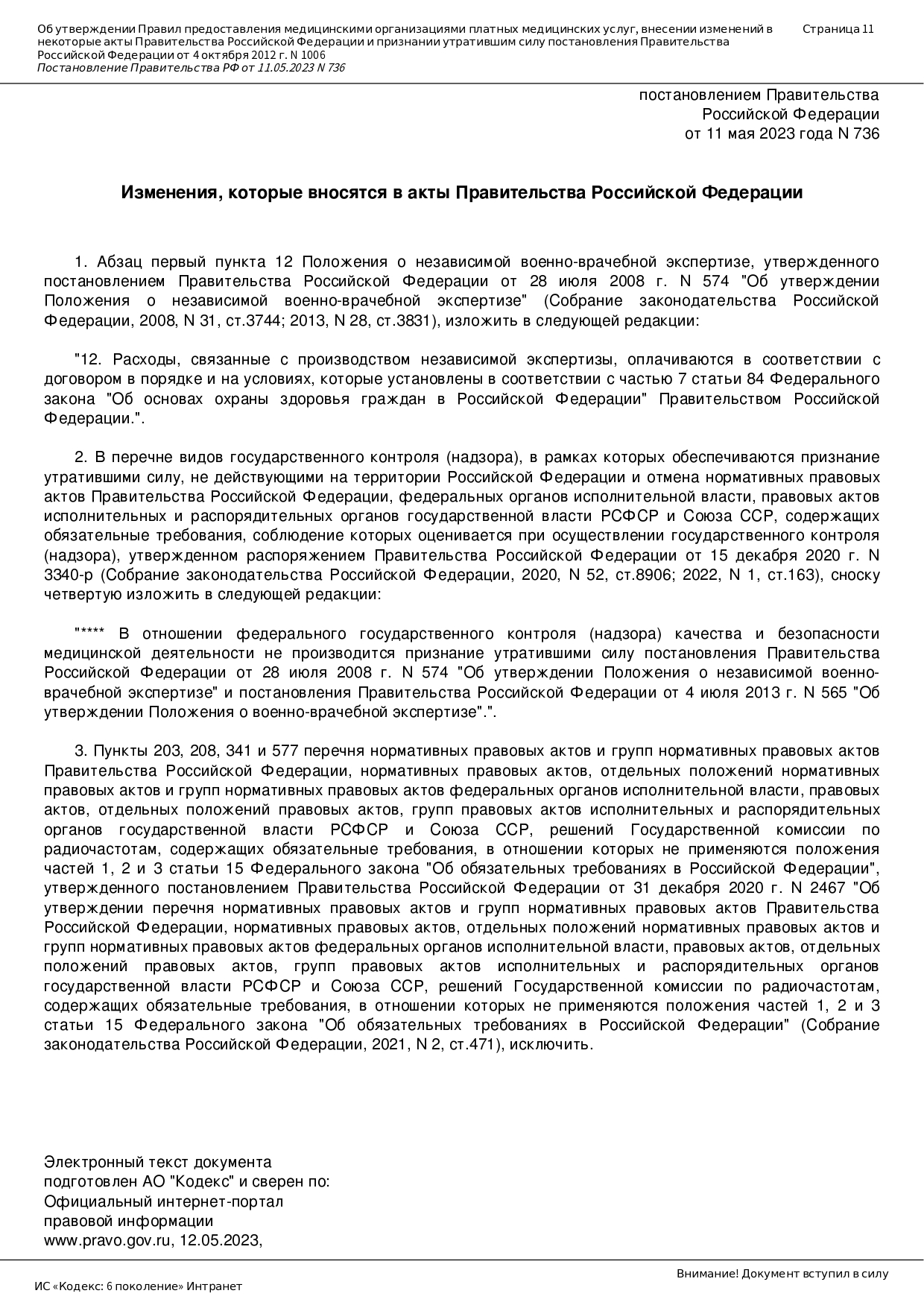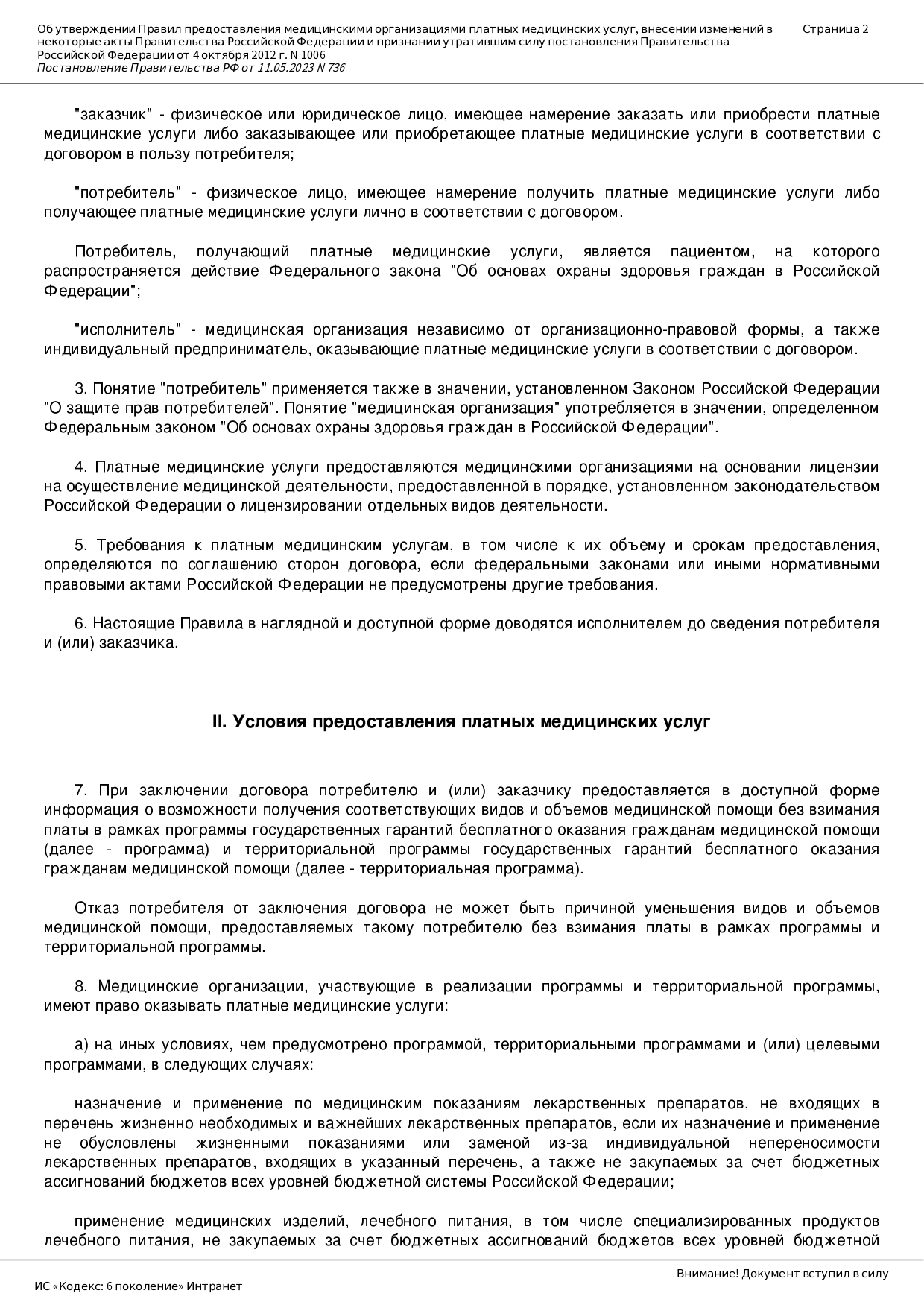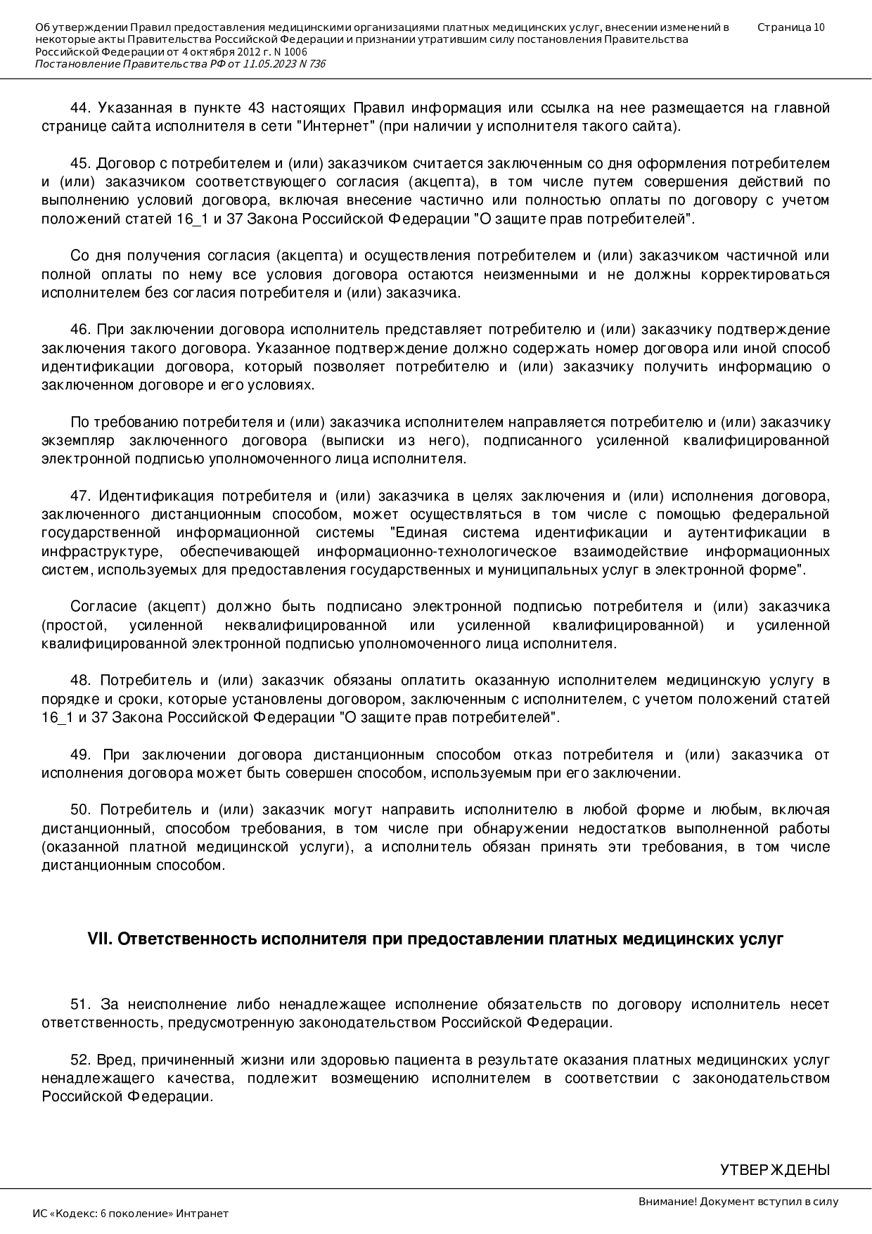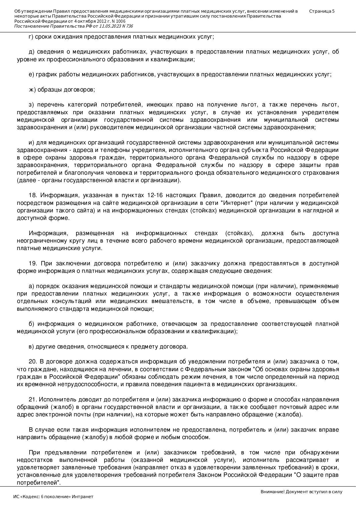 Постановление Правительства РФ от 11.05.2023 № 736 Об утверждении Правил предоставления медицинскими организациями платных медицинских услуг